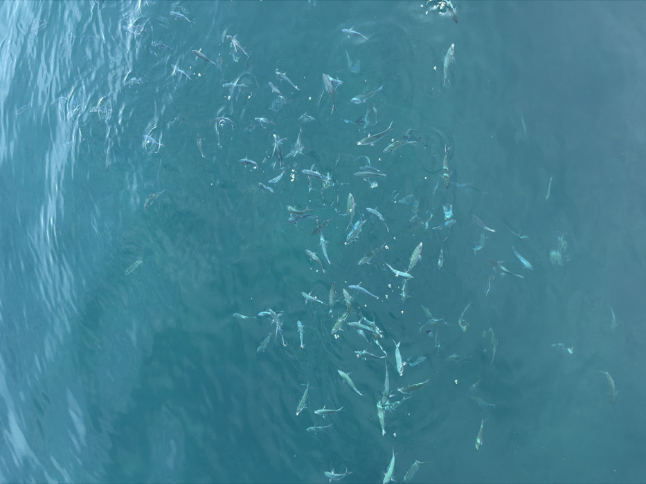 This image presents an overhead view of clear, turquoise-blue marine water, consistent with a coastal area in Rawai, Thailand. The water surface exhibits subtle ripples and reflections. A dense school of approximately 100 to 150 small, slender fish, predominantly silver or light grey with blue-green iridescence, occupies the upper and central portions of the frame. Individual fish range in length from an estimated 10 to 20 centimeters. They are actively swimming in various directions, with many oriented towards the water surface. Scattered white, irregular particles, consistent with food fragments, are visible on and just beneath the water surface, around which several fish appear to be congregating and feeding. No human subjects, vessels, or man-made structures are visible within the frame.