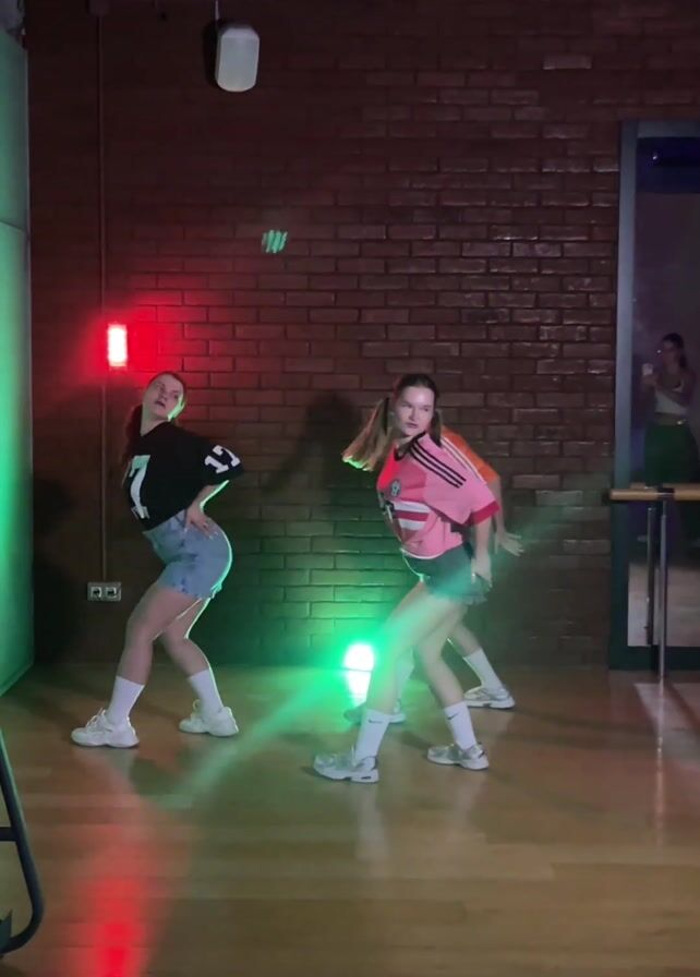 Three young women in athletic jerseys and denim shorts are dancing in a studio. The dancer on the left wears a black jersey with the number 17, the dancer in the center wears a pink jersey with the number 10, and the dancer on the right wears an orange jersey with the number 22. The dancers wear white socks and white sneakers. They are dancing in unison, moving their arms and legs rhythmically. The studio has a brick wall, a wooden floor, and a large mirror. Red and green lights illuminate the dancers. A person is visible in the mirror taking video on a cell phone. Music is playing in the background.