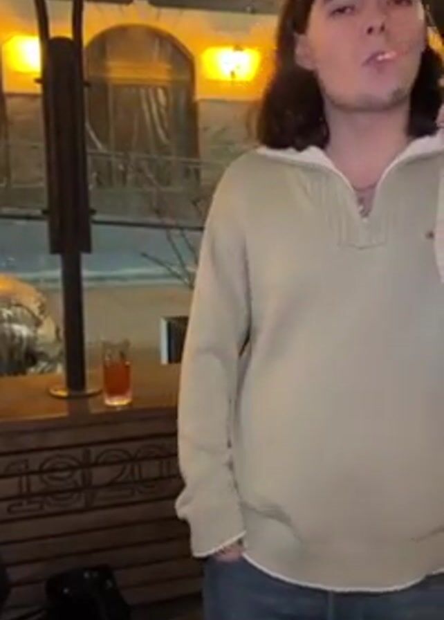 A young man with long, dark hair smokes outdoors while standing in front of an outdoor bar
