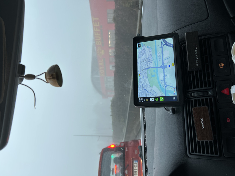The image captures a static view from the interior of a vehicle on a foggy morning in Geispolsheim, France. Heavy fog significantly reduces visibility of the external environment. Directly ahead, the rear of a red passenger vehicle, bearing a French license plate "CJ-091-XJ", is visible with its taillights illuminated, indicating either braking or running lights. To the right, a large red building with "ROYAL BUFFET" displayed in yellow lettering is partially obscured by the fog and a dark, dense hedge acting as a barrier. Inside the observer's vehicle, the dark grey dashboard is prominent. A portable navigation screen is mounted centrally, displaying a map application (Google Maps) with a city layout, green spaces, and a river. The screen indicates "09:04" for the time and "5G" for network connectivity. To the left of the screen, a rectangular "VINOVE" branded air freshener is clipped to an air vent. To the right, a "RITUALS..." branded air freshener is similarly attached to another air vent. Other dashboard controls, including an "ESP" button and a red hazard light button, are visible. A wooden, bell-shaped ornament hangs from the rearview mirror, which is partially visible at the top of the frame. No individuals are explicitly visible, but the presence of the vehicle and activated navigation implies an occupant. The vehicles appear to be stationary or moving slowly in traffic.