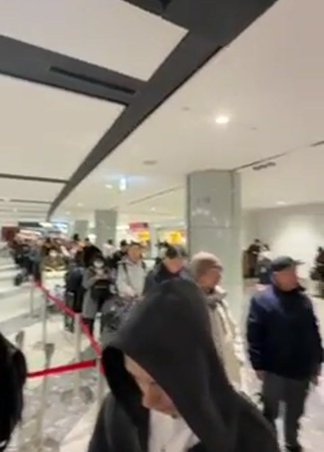 queue of people in what appears to be an airport terminal. The people are diverse in age and attire, many with luggage, including backpacks and rolling suitcases. They are standing in a line marked by red velvet ropes and metal stanchions. The terminal is well-lit with a modern design, featuring a high white ceiling, recessed lighting, and gray marble-like flooring. In the background, there are shops and signage in what looks like a duty-free area, including a Coca-Cola display. The camera moves slightly as it films the scene, giving the impression of someone standing in the queue.
