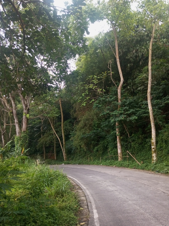 A winding paved road cuts through a lush, green forest. Tall, slender trees line both sides of the road, their leaves forming a dense canopy overhead. The foliage is thick and varied, with a mix of trees, bushes, and ferns covering the hillsides. The road curves gently, disappearing into the dense greenery ahead. The atmosphere is serene and natural.