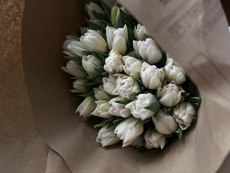 - "The image displays a dense bouquet of numerous white, double-petaled tulips, wrapped in light brown kraft paper" by FM-VtWoE2, licensed under CC BY 4.0