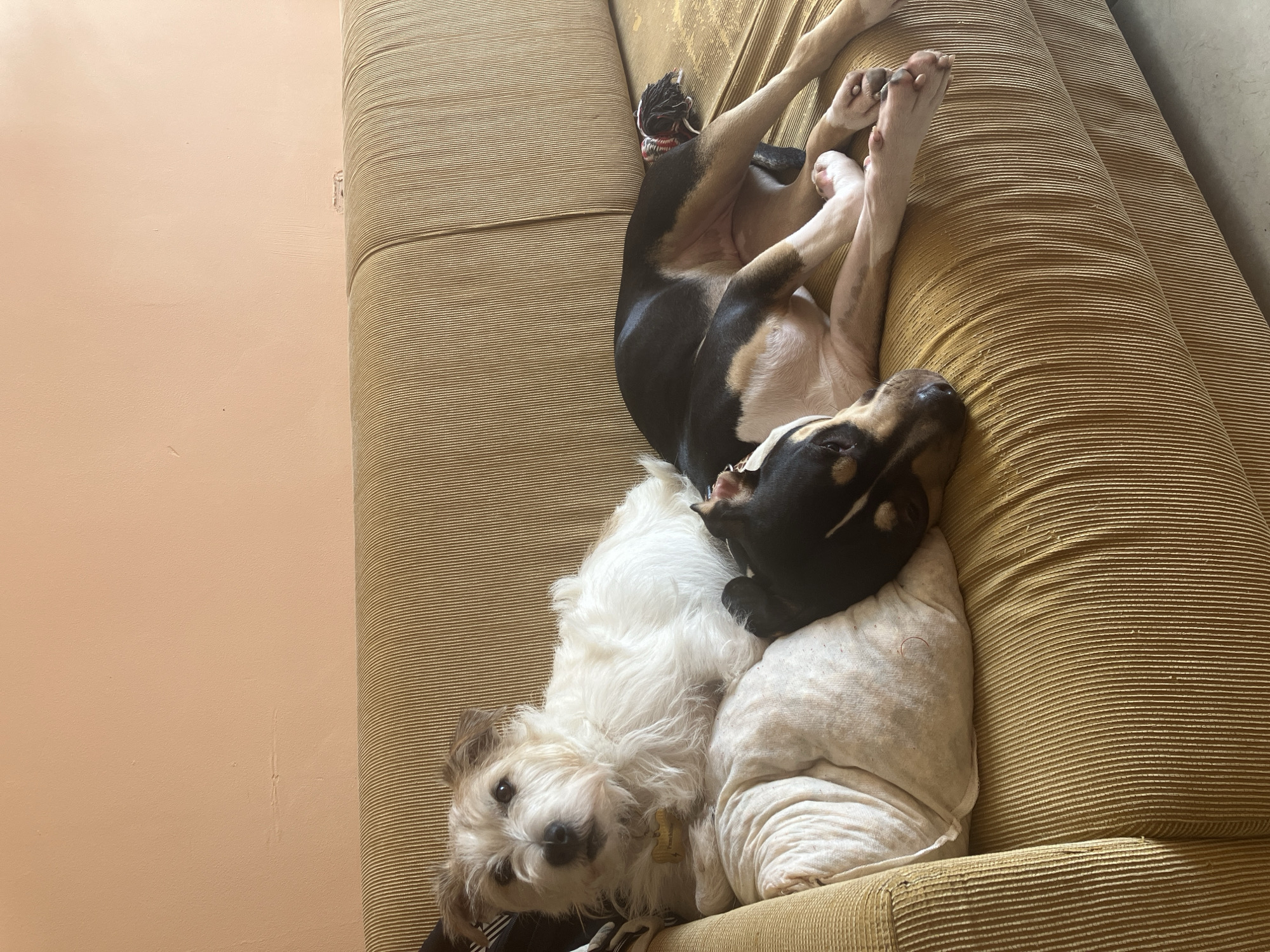 The scene takes place in an indoor setting within the city of Tel-Aviv, Israel, specifically in what appears to be a living area. Two dogs are resting on an ochre-colored, ribbed fabric sofa. The wall behind the sofa is painted a light peach color and exhibits minor surface imperfections, including a horizontal series of scuffs and a small chip. On the left, a medium-sized, shaggy-haired dog, predominantly white with light brown accents, is lying partially upright on a crumpled off-white blanket or cushion, looking forward with its gaze directed towards the viewer. A bone-shaped tag, partially engraved with 'Franklin', is visible on its collar. Adjacent to it, on the right, a second medium-sized dog with a short, smooth coat, primarily black with tan and white markings, is lying on its side, with its head resting on the same off-white blanket/cushion. Its eyes appear closed or partially closed. A red, white, and black braided rope toy is positioned near its hindquarters, between its body and the sofa backrest. The sofa itself shows signs of wear, particularly along the top edges of the cushions. A sliver of a light-colored floor is visible at the bottom right of the frame.
