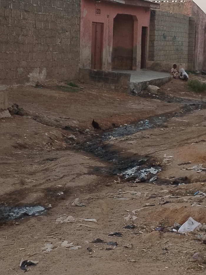 A wide dirt path is filled with trash and a small stream of dark liquid. A chicken stands in the middle of the path. Behind the path, a row of buildings with doorways and windows are visible. In front of one of the buildings, two children are playing. The scene is impoverished and lacks maintenance.
