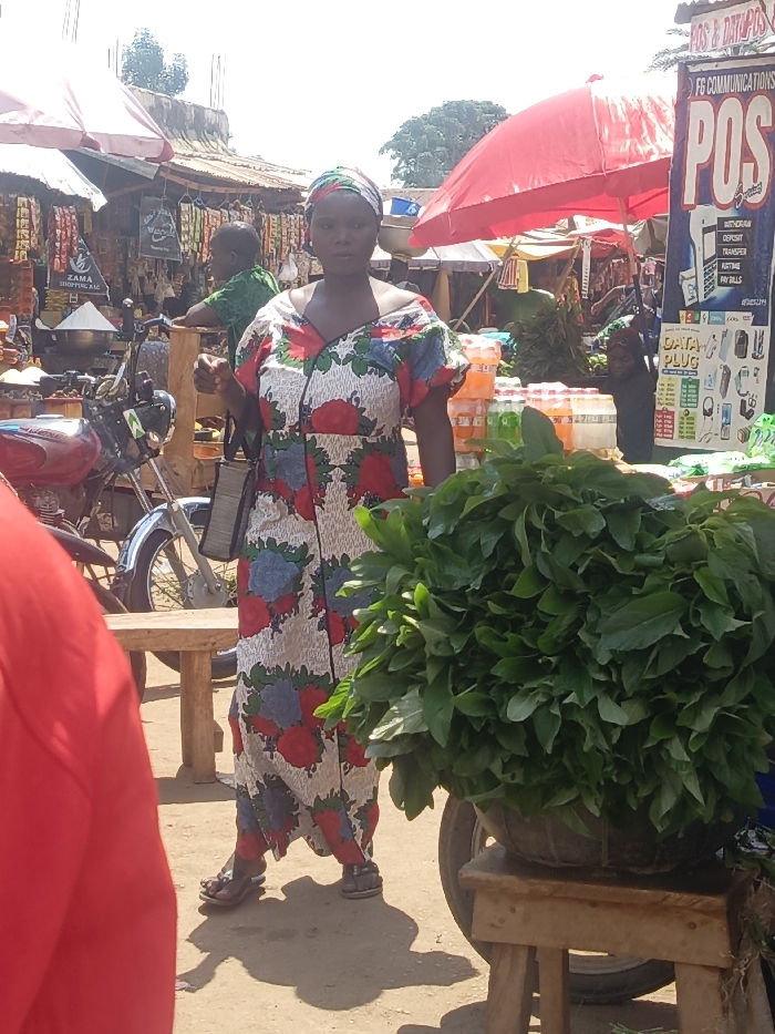 This image depicts an outdoor market scene in Akwanga, Nigeria, under bright daylight. A dark-skinned adult female stands prominently in the center-left, facing slightly right of the camera. She wears a long, short-sleeved dress featuring a floral pattern of red, blue, and green on a white background, with a matching headwrap and dark sandals. A small woven bag hangs from her left shoulder. Her right hand is slightly raised. In the immediate foreground, a partial view of a person in a red shirt is visible on the left. To the right foreground, a large pile of fresh, dark green leafy vegetables is displayed on a round container, which rests on a small wooden stool. A wheel is partially visible behind the stool. In the background, a bustling market environment is evident. To the left, a market stall with various packaged goods hanging is visible, along with a white bowl of unknown contents on a table labeled "ZAMA SHOPPING LLC." A red motorcycle is parked nearby. Another individual in a green shirt is partially obscured behind the motorcycle. To the right background, a large red umbrella provides shade over a display of bottled beverages. A tall banner advertising "POS & DATA POS" and "FG COMMUNICATIONS" details services like "WITHDRAW, DEPOSIT, TRANSFER, AIRTIME, PAY BILLS," and "DATA PLUG." Another person, obscured, stands near the POS sign. Corrugated metal roofs are visible on market structures, and the ground appears to be unpaved dirt.