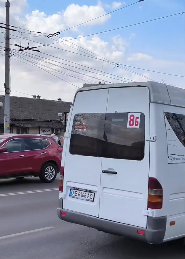 street scene on a partially cloudy day. Several cars drive past a group of people standing on the sidewalk, holding signs in support of Ukraine. A white Sprinter van with Ukrainian text on the side is parked on the street. Buildings and power lines are visible in the background, along with a large billboard.