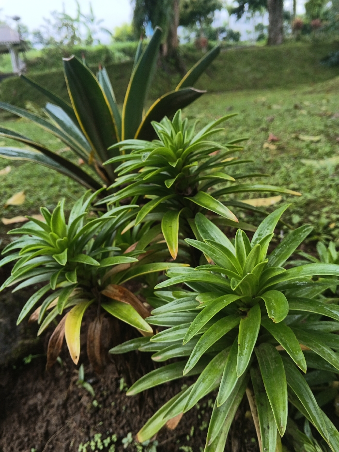 The image displays a close-up, ground-level perspective of three clumps of unidentifiable green, strap-leaved plants rooted in dark brown soil in Unknown, Vietnam. The plants feature numerous vibrant green leaves, with some lower leaves exhibiting yellowing and brown discoloration. Small droplets of moisture are visible on select leaf surfaces. In the mid-ground, slightly out of focus, is a larger plant with robust, dark green, lanceolate leaves characterized by prominent yellow margins. The background reveals a gently sloping, expansive grassy area interspersed with several mature trees with visible trunks. A faint, light-colored structure, possibly a small pavilion or shelter, is discernible on a distant rise within the landscape. The scene is illuminated by diffuse daylight under what appears to be an overcast sky. No individuals, actions, or interactions are present.