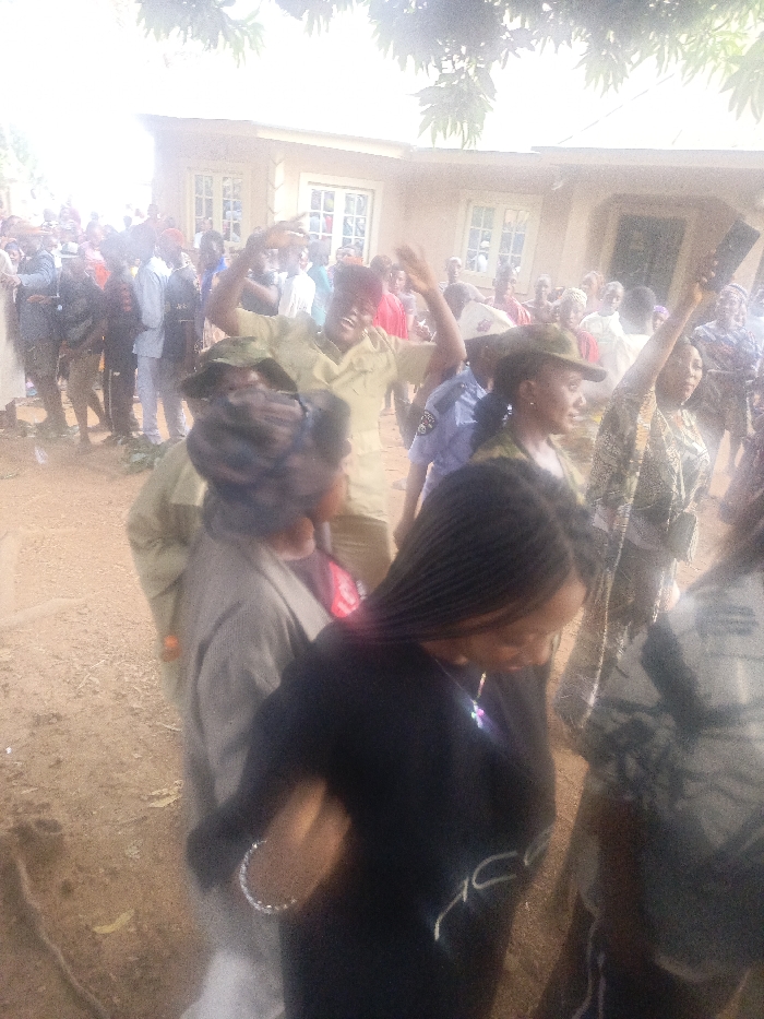 A crowd of people stands outside a building. A man in a khaki uniform raises his hands in excitement. Two women in military-style hats stand nearby. A woman in a black shirt looks down. A police officer is visible in the background. The ground is covered in dirt. The building has two windows and a simple roof. A tree is visible in the top of the frame.