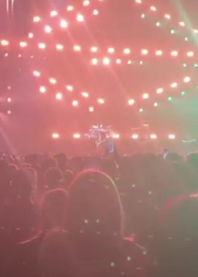 A crowd is watching a concert. A band plays on stage, illuminated by green and pink lights. Some people in the crowd are holding up their phones to record. A large screen behind the band shows the drummer. The guitarist is in the foreground.