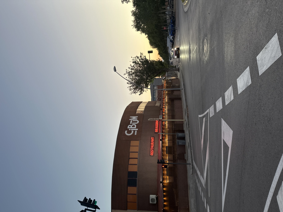 The image depicts a dusk scene at a street intersection in Cornellà de Llobregat, Spain. The sky exhibits a gradient from light blue at the zenith to orange and yellow near the horizon. The primary subject is a two-story, curved commercial building on the left, featuring a brown facade, possibly wood-paneled. Large white letters spell "CIBUM" on the upper section, while red neon signs below indicate "RESTAURANT" and "BRASERIA" above a lit outdoor patio. The patio is enclosed by a dark, patterned fence and illuminated by warm, visible string lights. An exterior air conditioning unit is mounted on the building's left side. Two dark grey bins are positioned on the sidewalk directly in front of the building. In the foreground, the asphalt road displays white dashed lines and white triangular yield markings. A green traffic light is partially visible on the far left, while a red traffic light is active closer to the building. A light-colored car with illuminated headlights is driving towards the camera, appearing to navigate a turn on the right side of the street. Multiple other vehicles are parked further down the street, lining the right side of the road. Trees with dense foliage are present along the right side of the road, and a tall, modern street lamp stands upright to the right of the main building. No individuals are visible.