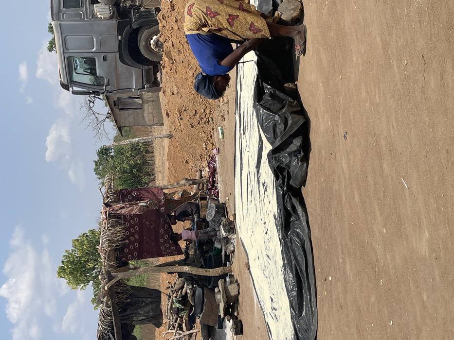 A woman in a blue top and butterfly-patterned skirt bends over a long, black plastic sheet with a white substance on it. Beside her, under a makeshift shelter, another person is visible. A large truck is parked nearby. The ground is brown, and the sky is light blue with scattered clouds. Trees and a building are in the background, completing the rural scene.