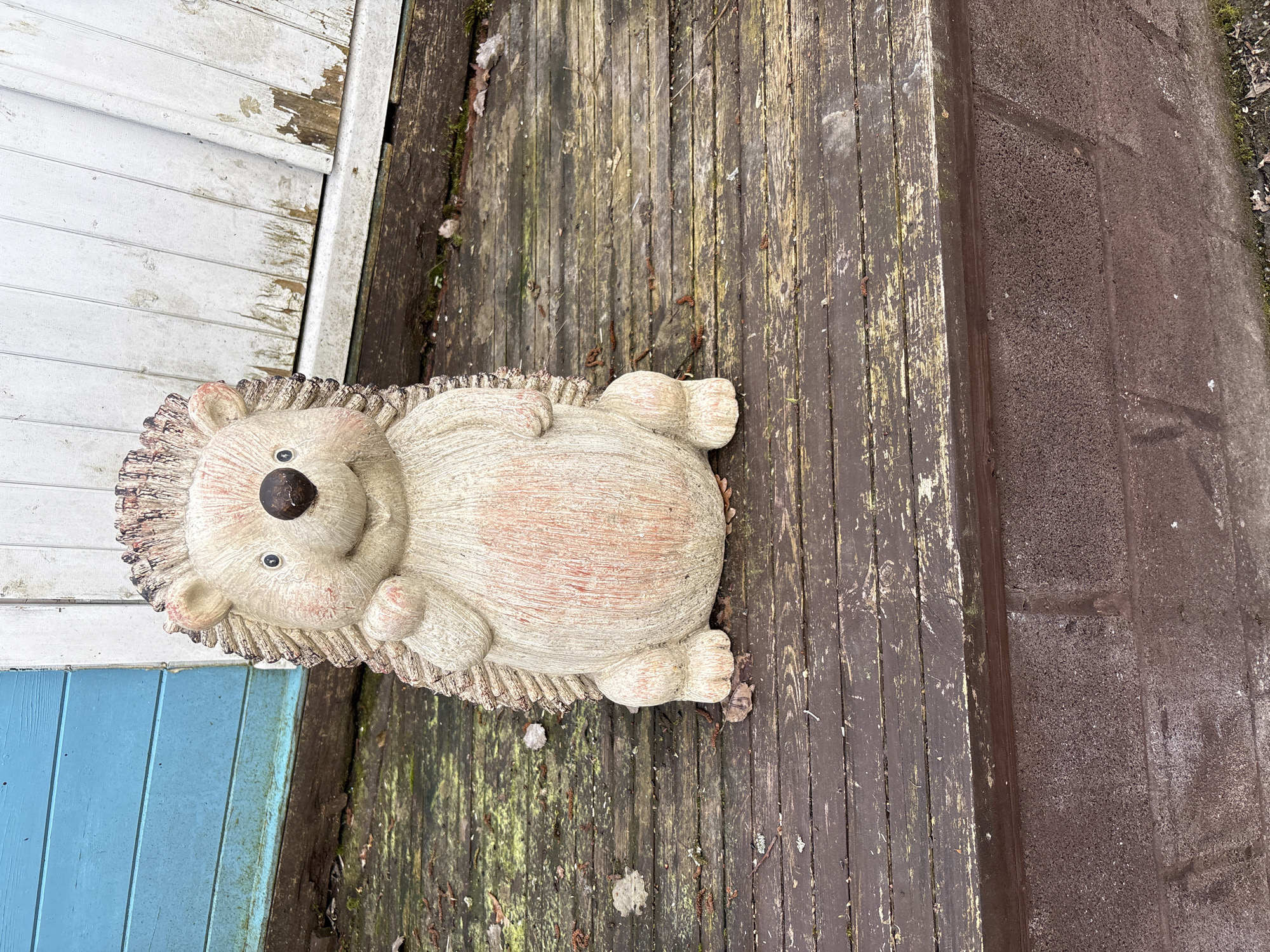 The scene depicts a static, light beige and brown hedgehog garden statue positioned centrally on a weathered wooden deck in Minsterley, United Kingdom