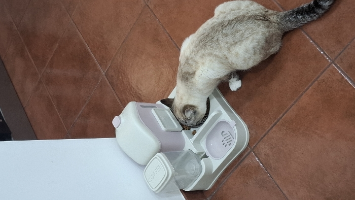 An indoor scene in the city of Unknown, Unknown, depicts a light-colored, short-haired cat with darker points, possibly a Siamese-mix, consuming kibble from an automatic pet feeder
