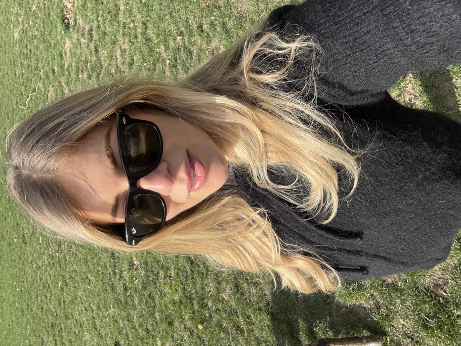 An adult female, with long, center-parted, blonde wavy hair, is depicted from the upper torso upward in a selfie-style photograph, looking directly towards the camera. She wears black Ray-Ban Wayfarer sunglasses, with the brand logo visible on the left lens, and a black, textured, long-sleeved hooded top. Her lips are closed and appear light pink. The background consists of green grass with scattered brown foliage, suggesting an outdoor park or field environment under direct sunlight. A light-colored object, possibly wood, is partially visible on the far left. The scene is located in Asnières-sur-Seine, France.