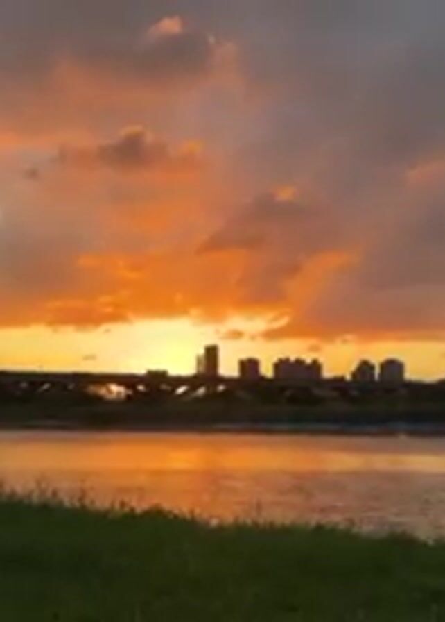 sunset over a river with a cityscape in the background. The sky is filled with clouds, illuminated by a bright orange sunset. The sun reflects off the water's surface. A bridge spans the river in the middle ground. In the foreground is a patch of green grass. The silhouette of buildings is visible against the skyline. The audio includes speech, mentioning 'bus' and 'metro'.