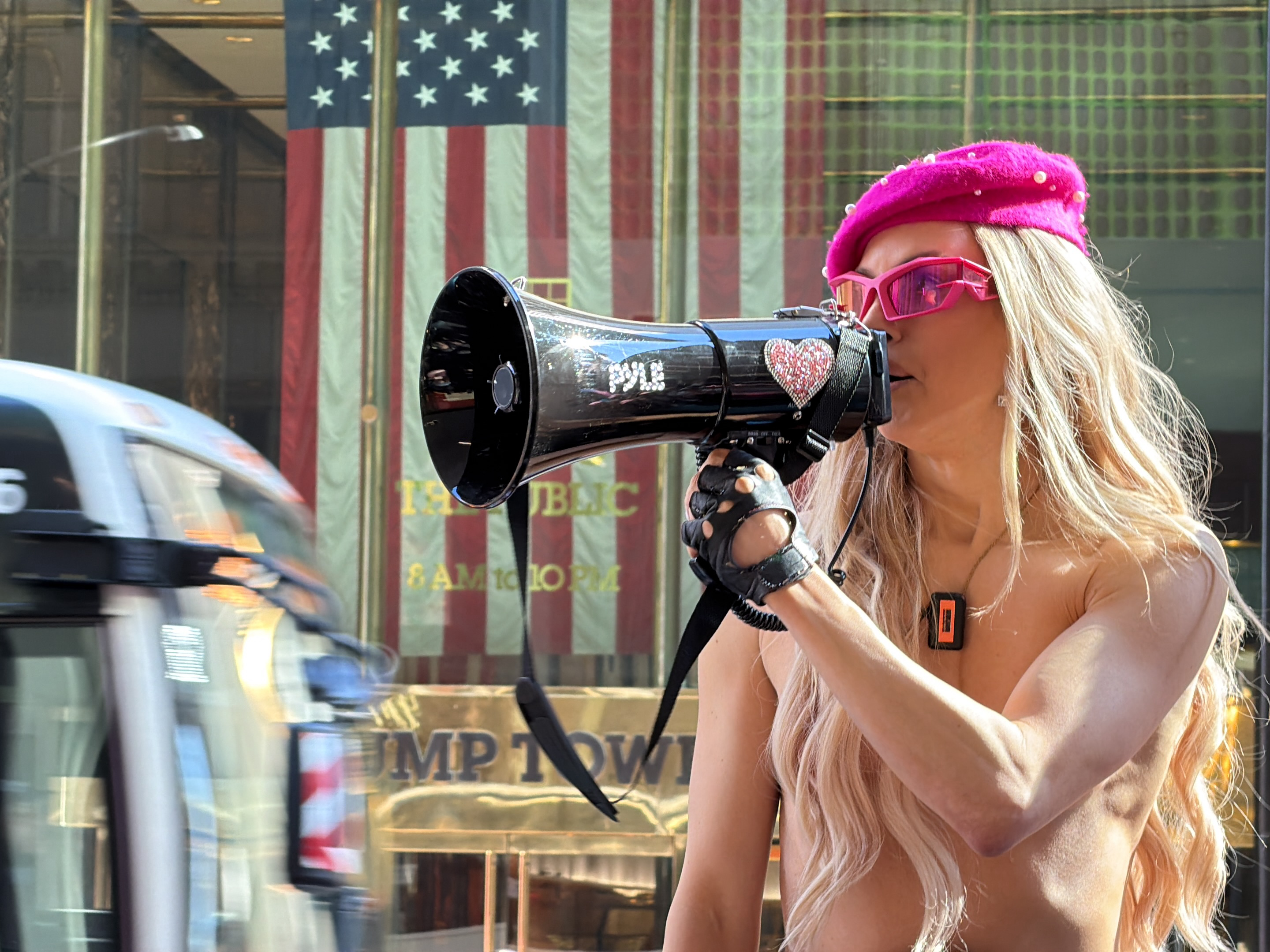 A person is pictured in New York City, holding a megaphone with a glittery heart decoration. They are wearing a pink beret, pink glasses, and black fingerless gloves. They also have a necklace and long blonde hair. An American flag is visible in the background, with a building behind it that says "TRUMP TOWER" on it. There is also a car blurred in the foreground.