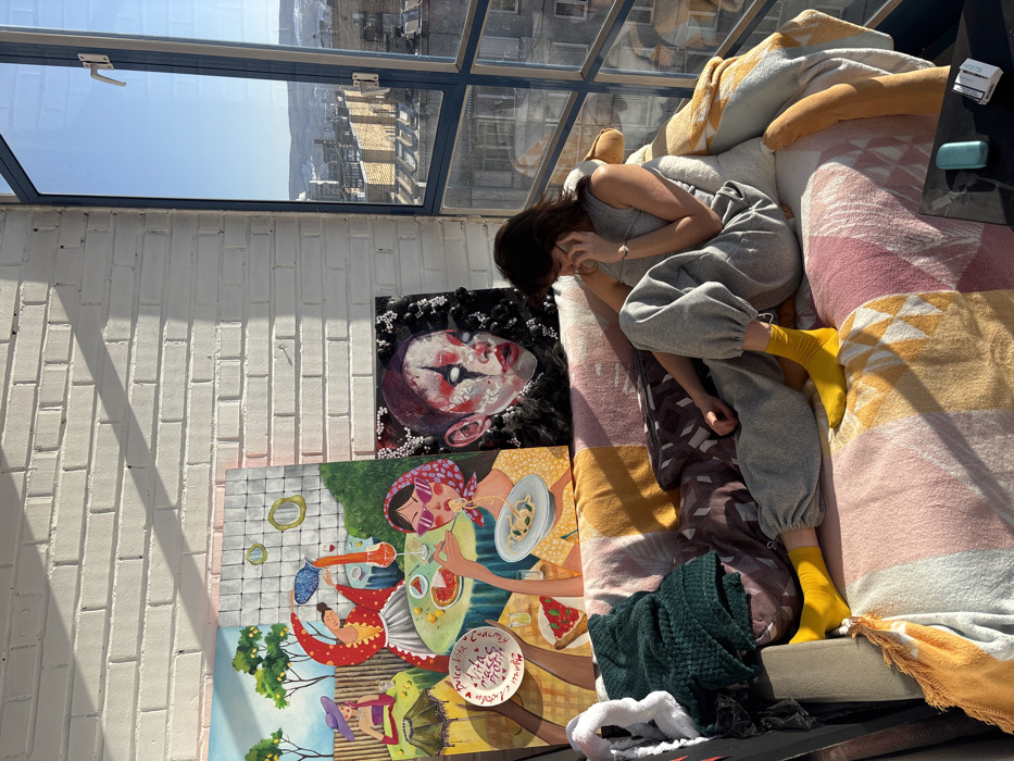 An individual is depicted seated on a multi-patterned couch inside an urban dwelling in Krasnoyarsk, Russia, illuminated by direct sunlight streaming through a large window. The person, with short dark hair, wears a grey sleeveless top, grey sweatpants, and bright yellow socks, and is actively holding a smartphone to their right ear, engaged in a conversation. To the left of the individual, propped against a white-painted brick wall, are two distinct paintings. The larger, left painting features a vibrant, cartoonish scene with multiple women in an outdoor setting, one pouring liquid, another eating pasta, with elements like lemons, pizza, and a decorative plate visible. The smaller, right painting is a dark, textured portrait of a face with clown-like white, black, and red makeup, featuring prominent white eyes and bead-like embellishments. The couch is covered with blankets displaying geometric patterns in shades of pink, yellow, orange, and brown. A dark green knitted blanket and a white fluffy item are draped over the left armrest. On a dark surface near the window, a light blue electronic device and a white packet, possibly a cigarette pack, are visible. Beyond the multi-paned window, a clear blue sky extends over an urban landscape featuring various buildings and distant, possibly snow-dusted, hills. Shadows from the window frame are cast distinctly onto the interior brick wall and the couch.