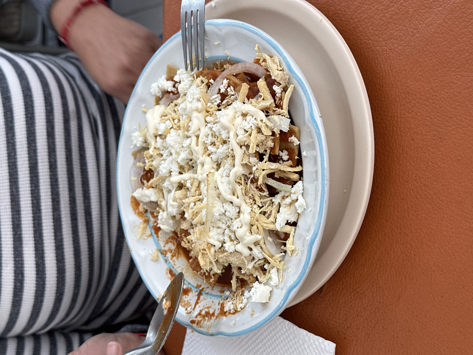 A close-up shot reveals a plate of chilaquiles, generously topped with crumbled white cheese, shredded chicken, and drizzled with sour cream