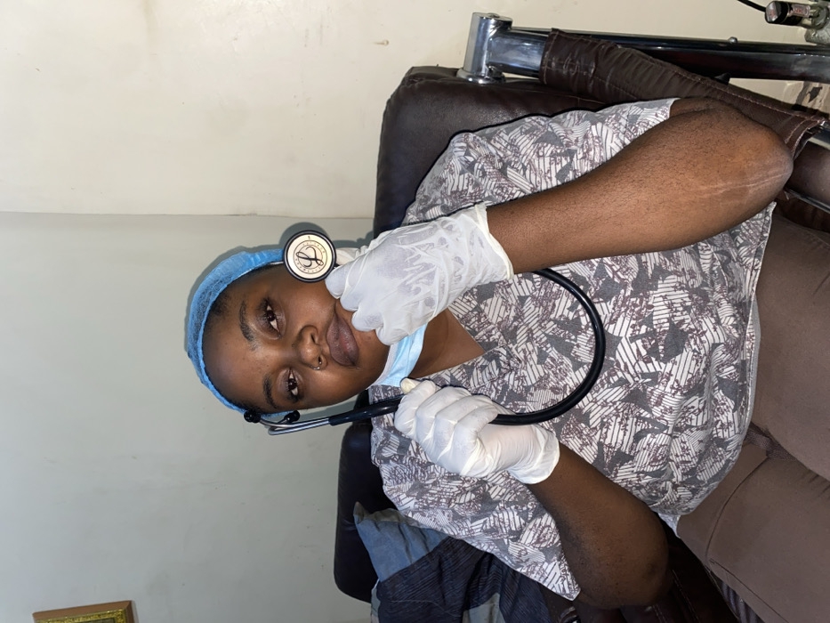 A young woman in medical attire, including a blue surgical cap, patterned scrub top, and white gloves, is seated. She holds a stethoscope with the earpieces around her left ear and the chest piece near her mouth. A disposable face mask hangs below her chin. She is sitting in what appears to be a padded chair, and her expression is neutral. The scene suggests a medical setting.