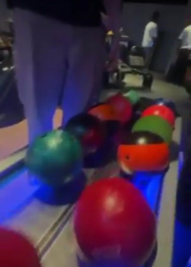 The video takes place at a bowling alley. The camera is initially focused on a rack of bowling balls, including red, green, orange, and black balls. The camera then pans up to show two young men. One man wearing glasses poses and then looks at his phone. The other man, in a black shirt, is visible in the background. The environment is dimly lit with blue lighting illuminating the ball rack. Other people are seen in the background.