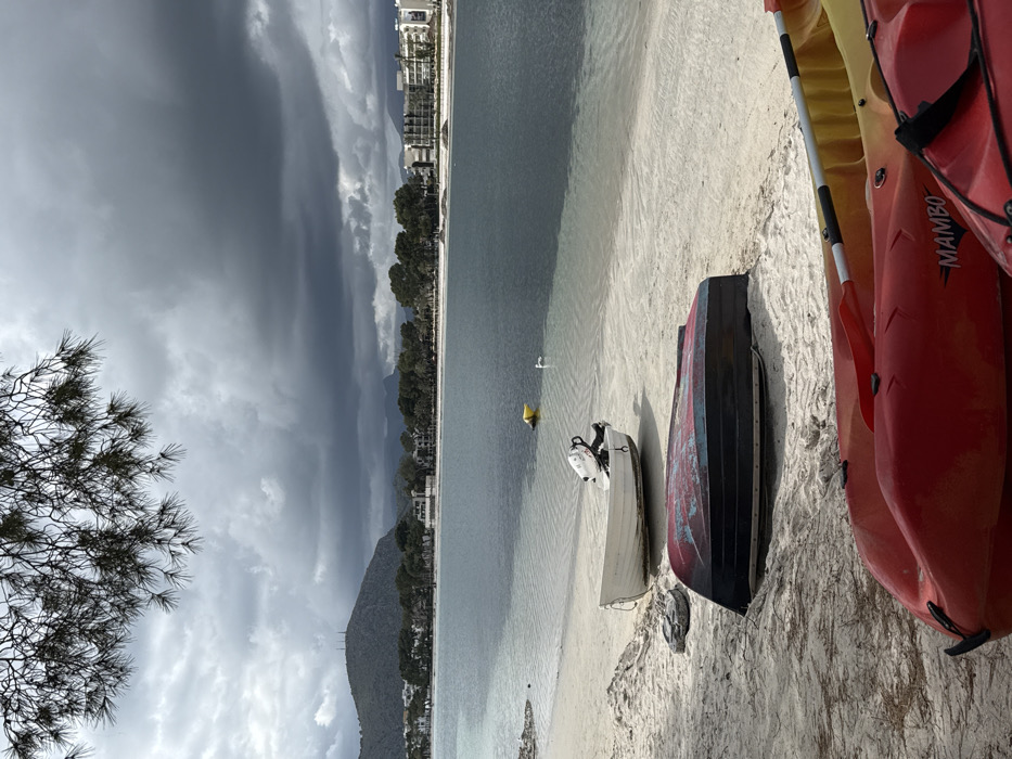 The image depicts a sandy beach in Alcúdia, Spain, under an overcast sky dominated by dark, heavy clouds. Overhead, a branch with pine needles partially extends into the top left of the frame. The beach consists of light-colored sand. Three distinct boats are present on the sand: a white open boat with an attached outboard motor is positioned upright near the water's edge, exhibiting coiled ropes in its bow. Behind it, an upside-down boat with a weathered red and black hull rests on the sand. In the lower right foreground, two kayaks are partially visible, one red with "MAMBO" branding and a paddle resting on it, and another yellow-orange. The water immediately adjacent to the beach is clear and turquoise, transitioning to a deeper blue further out, displaying subtle ripples. A yellow buoy and a white bird float in the mid-ground water. The distant shoreline features a line of green trees and multiple multi-story buildings. A prominent hill with antenna-like structures on its summit is visible in the far left background, set against a backdrop of distant mountains. No people are visible in the scene.