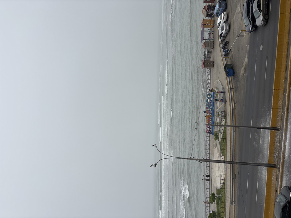 The image depicts an elevated view of the Barranco district in Lima, Peru, under an overcast sky. The scene is dominated by a gray, uniformly cloudy sky merging with a gray, wavy ocean horizon. The ocean exhibits multiple visible wave lines, and at least three individuals are present in the water, consistent with surfing activity. In the midground, a concrete promenade runs parallel to the coastline. A prominent, multi-colored sign spelling "BARRANCO" is situated on the promenade's central section. Approximately ten to fifteen individuals are distributed across the promenade, with several grouped around the "BARRANCO" sign. Small green landscaped areas with low vegetation are visible along the promenade. A light-colored railing separates the promenade from the immediate beachfront. To the right, a cluster of small, single-story structures with varying colored roofs (red, blue, brown) are arranged, suggestive of kiosks or vendor stalls. Below the promenade, a two-lane asphalt road with white lane markings runs horizontally across the frame. Adjacent to the road on the right, a parking area contains multiple parked vehicles, including several sedans and a van. Two motorcycles are also parked in this area. A blue garbage bin is positioned near the parking zone. A yellow concrete barrier separates the road from the foreground area. In the immediate foreground, two tall, dark-colored streetlights with curved arms extend vertically. The left streetlight has two gulls perched on its upper section. A dark-colored vehicle is partially visible in the bottom-left corner of the frame. A white, granular substance is scattered on the ground along the base of the streetlights and the yellow barrier.