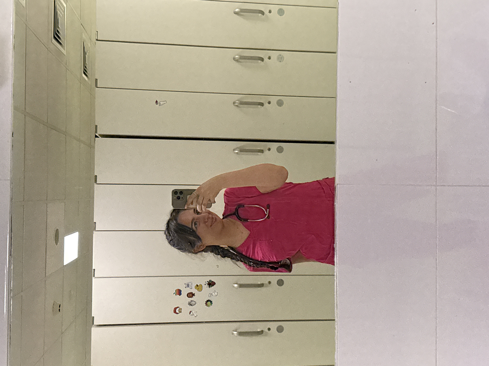 A woman in a pink top with a stethoscope around her neck is taking a selfie in front of a light-colored locker or cabinet unit