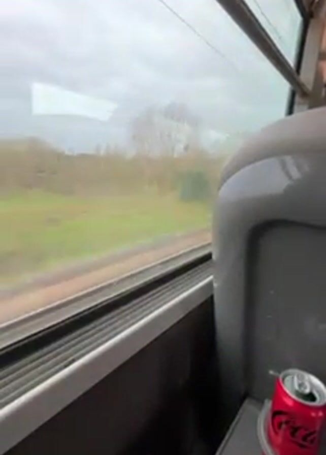 view from inside a moving train. Outside the window, the landscape passes by, featuring fields, trees, and an overcast sky. A can of Coca-Cola sits in a cupholder attached to the train seat. A hand is visible near the bottom of the frame, resting on the surface next to the cup holder.