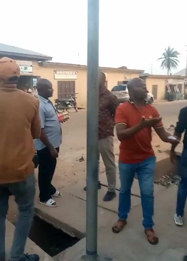 group of men standing on a sidewalk near a road. There are buildings visible in the background, including one with a sign that reads "ELECTRICAL COMPANY." Some of the men are talking and gesturing, while others are just standing and observing. A car and motorcycle are parked nearby. There is a metal pole attached to the sidewalk. The video is shaky and the audio is unclear.