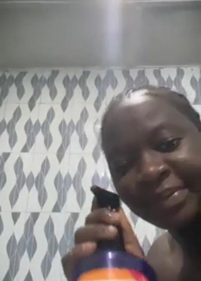 A person is in a bathroom and is holding up a bottle of Dr. Teal's Body Wash with Vitamin C & Citrus Oils. The bathroom has grey and white geometric patterned tiles. The person appears to be taking a video.