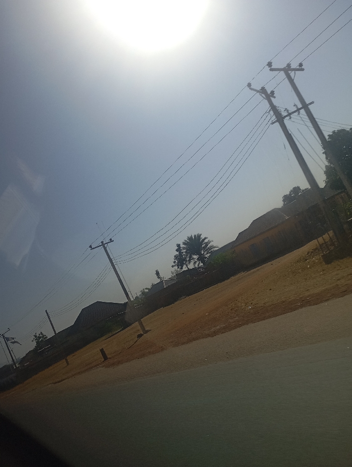 The image displays an outdoor scene under a bright, intense sun located in the upper left quadrant of a pale blue sky. The perspective is tilted, with the horizon line sloping upwards from left to right. In the foreground, a dark grey paved road runs diagonally across the lower portion of the frame. Adjacent to the road, a wide strip of dry, light brown, sandy earth extends towards the mid-ground. Several small, dark, rectangular posts are embedded vertically in this earth strip, suggesting boundary markers. Multiple wooden utility poles with numerous black power lines traverse the scene horizontally. A prominent utility pole stands in the mid-ground on the right side, featuring at least two cross-arms. Another pole is visible further left. Behind the utility lines and the dry earth, various structures are visible, including residential-style buildings with dark roofs. One building in the mid-ground exhibits light-colored (possibly beige or yellow) walls. Sparse vegetation, including a visible palm tree-like structure, is present in the background. The overall environment appears semi-urban or rural, consistent with areas within the city of Bauchi, Nigeria. No people or vehicles are discernible within the frame.