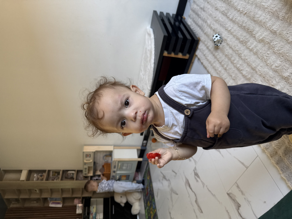 An indoor residential scene in Almere, Netherlands, features two young children within a furnished room. In the foreground, a toddler, approximately 1-2 years old, with light brown curly hair, is centered, facing the camera. This child wears a white short-sleeved t-shirt and dark grey overalls secured with wooden buttons. A red substance is visible around the child's mouth, and a small red object, consistent with a berry, is held in the left hand, which also bears a gold-colored bracelet. The child stands on a light beige shaggy rug. In the mid-background on the left, a second child, estimated to be 2-4 years old, stands with their back largely to the camera, wearing light-colored clothing. This child is positioned in front of a white and light-wood toy kitchen set, actively engaging with it. Adjacent to the toy kitchen, a large white teddy bear rests on a colorful play mat. Further left and behind, a tall, light-wood shelving unit stocked with various items is visible against a light-colored wall, which transitions to a vertical wooden slat panel. To the right of the foreground child, a low, black, multi-tiered console table topped with a white, fuzzy textile is situated against the wall. A small black and white patterned ball lies on the beige rug near the right edge of the frame. The flooring consists of large format, light-colored tiles with grey veining on the left, transitioning to the beige shaggy rug on the right. The room is brightly lit.