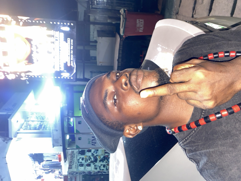A man wearing a hat and a necklace with red and black beads is giving the middle finger. He has a goatee, and an earring is visible on one ear. In the background, there is a store, a gas station, and a trash can with the words "Happy Family" on it. A bright sign is shining over the store. The man is standing next to a car.
