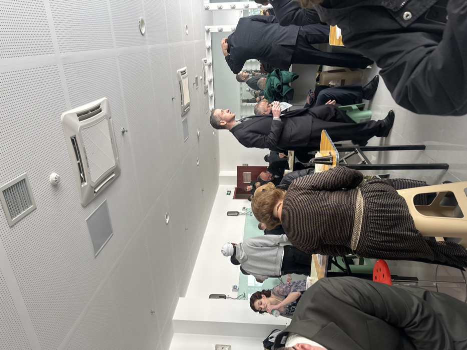 The scene depicts an indoor room in Huangdao District, China, functioning as a communal waiting or preparation area, possibly a dressing room. The room features a white drop ceiling with multiple ventilation grilles, recessed lighting, a smoke detector, and two large, ceiling-mounted air conditioning units. White walls display a green exit sign and a light green-blue panel with two wall-mounted speakers on the left. A large, brightly illuminated dressing room mirror stands on the right, reflecting parts of the room and individuals. A partially open wooden door is visible in the background. Approximately fifteen to twenty individuals are present. In the mid-ground, a woman with reddish-brown hair, wearing a patterned dark brown dress, is seated on a light-colored plastic stool, facing away from the camera and looking down at a light-colored folding table. To her left, another woman with dark curly hair is seated, drinking from a clear plastic bottle. Behind them, a person in a grey hooded sweatshirt and white beanie stands facing away. In the mid-ground right, a man with short grey hair, dressed in a dark suit and tie, stands upright, holding a white object in his right hand. To his immediate right, another man in a dark suit, facing away, adjusts his head or hair with his right hand, his front reflection visible in the dressing room mirror. Numerous other individuals, many in dark suits, are seated at tables or standing, engaged in various activities, with a dark green jacket draped over a stool near the mirror. A red round stool is visible in the foreground.