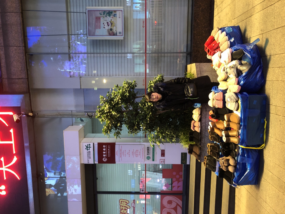 A nighttime scene in Yuzhong District, China, depicts a female street vendor standing beside her merchandise display on a paved sidewalk. The vendor, an East Asian female with short dark hair, wears a black winter coat with a fur-lined hood, a dark scarf, and a black crossbody bag. She stands centrally, looking directly forward with a neutral expression. Her merchandise consists of numerous pairs of new footwear, including winter boots and various slippers in colors such as black, brown, red, pink, beige, and grey. These items are neatly arranged on top of several large, blue plastic bags or tarps, which serve as elevated display platforms directly on the sidewalk. In the background, the illuminated facade of a modern building is visible. Identification includes a prominent red sign for "CMB" (China Merchants Bank) and Chinese characters indicating "招商银行" (Zhāoshāng Yínháng) and "EXCHANGE 货币兑换" (Currency Exchange). A security camera is mounted above the bank entrance. A small, leafy green tree is situated in a planter box between the building and the sidewalk, positioned directly behind the vendor. Large glass windows of the building reflect ambient light and neon signs, including partial red Chinese characters "天上" (Tiānshàng) above. The sidewalk is clean and composed of light-colored square paving tiles.