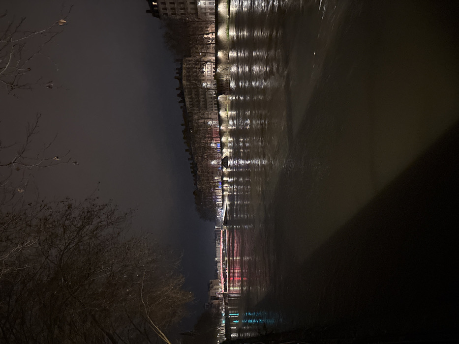 Night cityscape reflected on a dark body of water. Buildings line the bank, their lights shimmering in the water. Bare trees stand in the foreground. The sky is overcast, adding to the somber mood. The river's surface displays streaks of light, mirroring the city's glow. A bridge with red lights crosses the water. The overall scene evokes a sense of urban quietude.