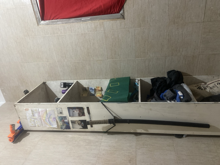 A long, white shelf unit with open compartments sits against a tiled wall. The compartments contain various items: money, a green object, clothes, and bags. The front of the unit is decorated with drawings, photographs, and a long black sword with a wrapped handle. A toy gun rests on the floor next to the shelf. A red cloth partially covers a window near the top of the frame.