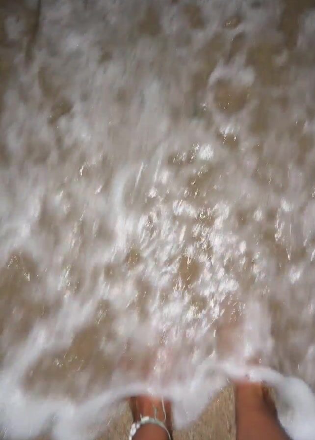 person's feet standing on a sandy beach as the ocean waves wash over them. The waves are foamy and white, contrasting with the tan color of the sand. The person is wearing a bracelet on one ankle. The camera is positioned looking down at the person's feet.