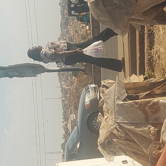 A man stands on a sidewalk, holding a white plastic bag. He is wearing a short-sleeved patterned shirt and dark pants. A gray car is parked on the street beside him. In the background, a densely populated urban area with buildings extending up a hill is visible. A tall communication tower rises above the buildings. To the right, there is debris or materials covered with plastic, obscuring the view. A sign is on a lamppost on the left side of the frame. The sky is clear.