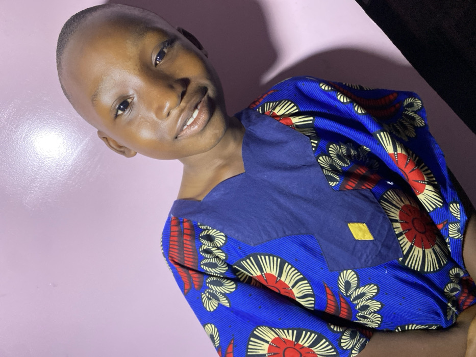 A young person with a closely shaved head is angled toward the camera, smiling slightly