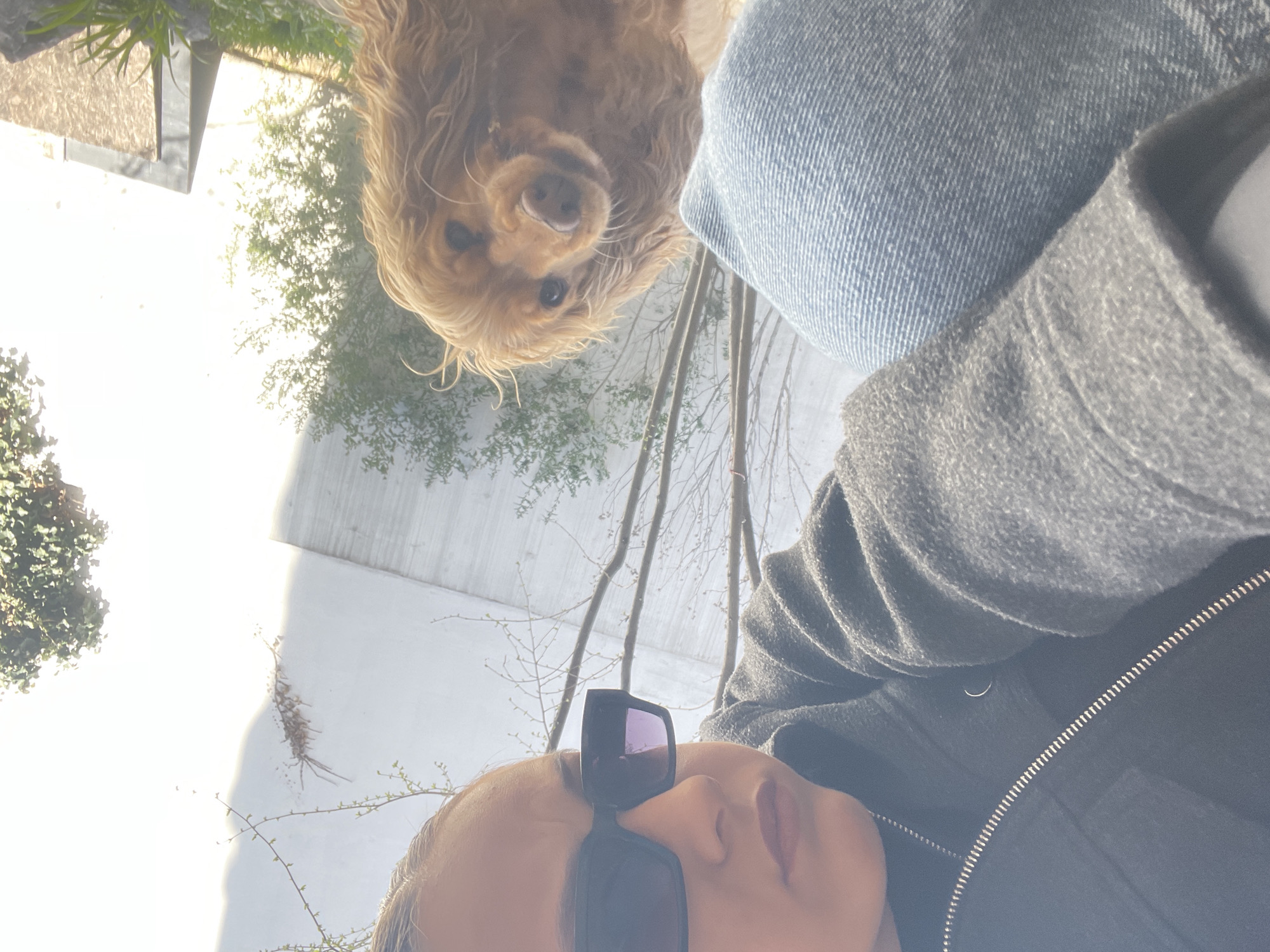 A low-angle selfie photograph depicts a woman and a cocker spaniel dog outdoors. The woman is seen from the chest up wearing a grey jacket. The woman's face is close to the camera and she is wearing sunglasses. The dog is positioned above and behind the woman. The dog appears to be looking down at the camera. In the background is a white wall with climbing plants and bare tree branches. The location appears to be outdoors, possibly a park or garden. No other elements are visible in the image that can suggest the location is Sofia, Bulgaria.