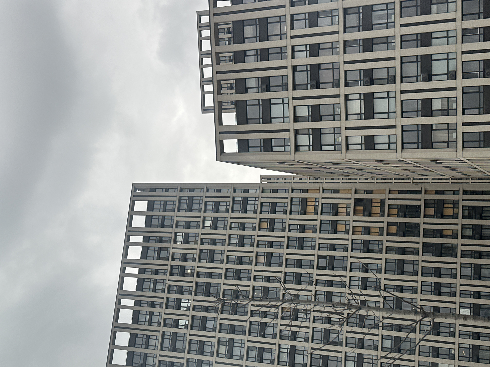 The scene depicts two modern multi-story buildings of the Rybalsky Residential Complex, located in the Podilskyi district of Kyiv, Ukraine, under an overcast sky. Both structures feature a grid-like facade composed of light grey concrete vertical and horizontal elements, framing dark-tinted windows. External air conditioning units are mounted beneath windows on numerous floors. Some windows display interior illumination, appearing yellowish-orange, while others reflect the cloudy sky or show opaque internal coverings. The rooftops of both buildings are characterized by distinctive open rectangular frameworks. A leafless deciduous tree with bare branches stands in the foreground, partially obscuring the left building. The sky is uniformly light grey with visible cloud formations. No individuals or active elements are present within the frame.