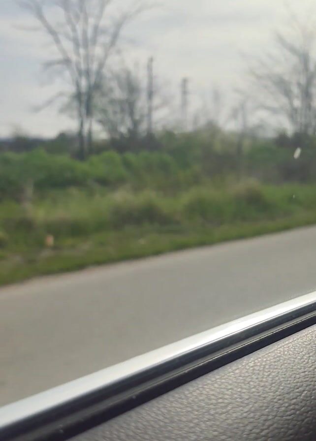 The camera films from inside a car as it drives along a grey asphalt road. The window frame, made of black textured plastic, is visible at the bottom of the frame. Outside the window, on the right of the road, is green grass and sparse trees, mostly bare with a few green leaves. The sky is overcast, a light grey. There are power lines above the trees.