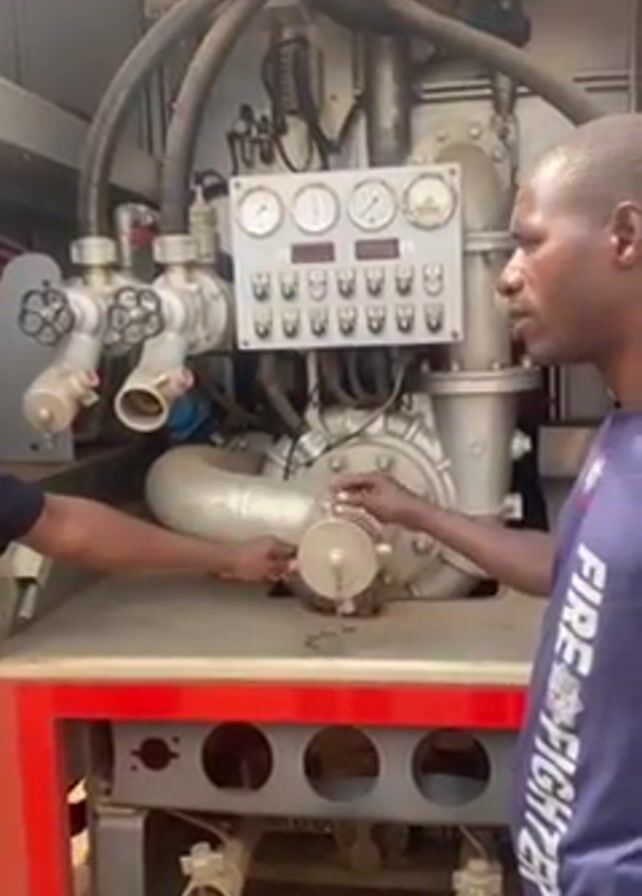 Two men are examining the back of a fire truck. The man on the right is wearing a blue shirt that reads "FIREFIGHTER". The other man has his left hand on a capped outlet on a large silver machine with a network of pipes and hoses behind it. There is a panel with gauges and switches mounted above the machine. The fire truck is red and silver.