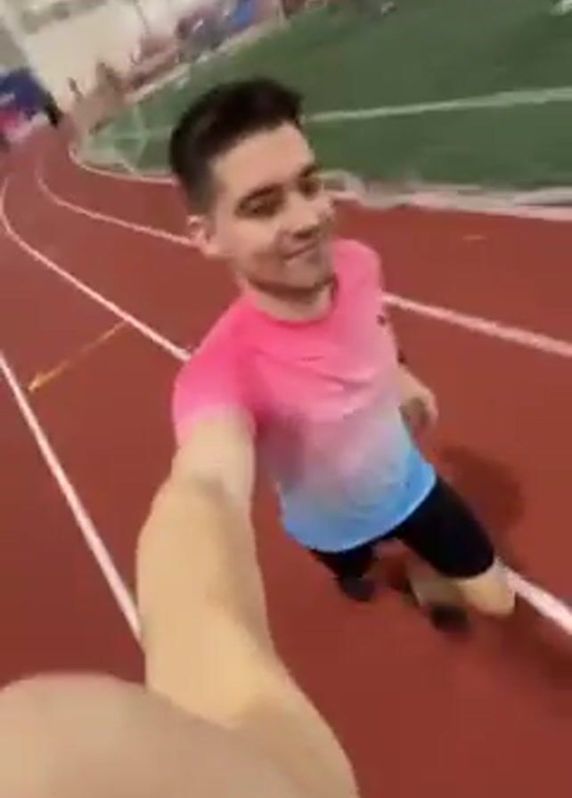 A person with dark hair and a pink and blue shirt is running on a red indoor track while holding a phone to record themselves