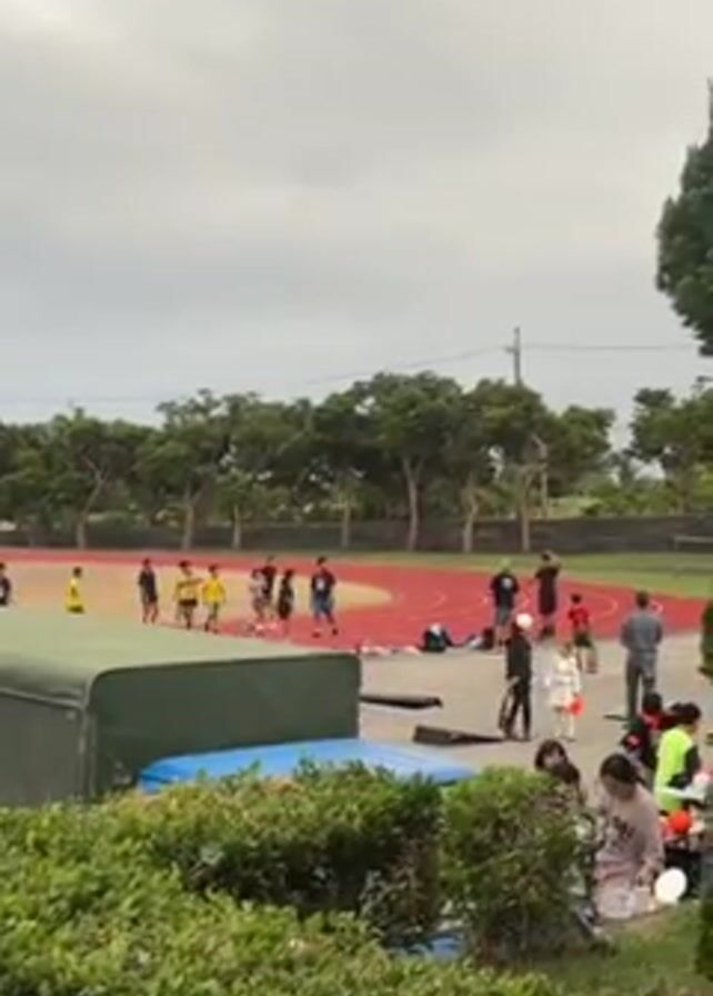 The scene captures a wide shot of an outdoor track and field area with a group of children and adults