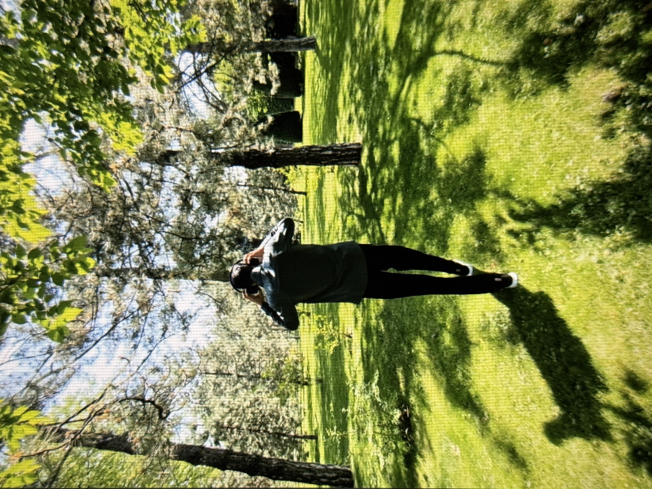 A person is lying on a grassy field under the shade of trees, looking upwards. The individual wears black leggings, white shoes, and a dark-colored top, with their arms crossed behind their head. Sunlight filters through the leaves, creating dappled shadows on the green grass. Trees surround the person, framing the scene, with a clear sky visible through the branches. The composition emphasizes the contrast between light and shadow and the person's relaxed pose.