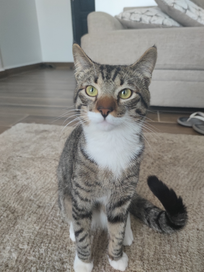 - "A domestic tabby cat with grey-brown stripes, a prominent white chest bib, white muzzle, and white paws is centrally positioned, sitting upright on a light beige textured rug" by FM-ny0hG3, licensed under CC BY 4.0