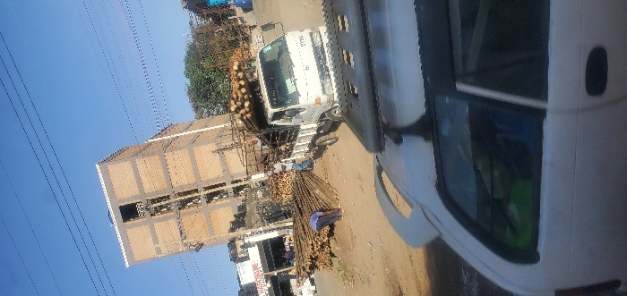 A truck laden with logs and steel bars is parked near a multi-story building with rectangular facades. Several people are near the stacked steel bars. Power lines stretch across a clear sky above the building. A partial view of a vehicle, possibly a car, is prominent in the foreground, obscuring the road. A sign is visible on a storefront near the building.